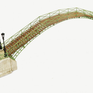 Alors grâce à Debelem les modélistes pourront reconstituer cette scène en HO avec la passerelle de la Grange aux belles en kit à 82 €. Les escaliers d'accès sont en plâtre polyester, l'ensemble de la superstructure est en carton et les tirants joignant les 3 arches en laiton. La longueur est de 480 mm pour une hauteur sous l'arche de 75 mm.